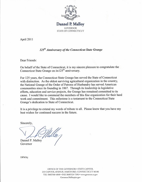| APRIL 21, 2011 -- The 125th Anniversary of the Connecticut State Grange has been formally recognized by Connecticut Governor Dannel P. Malloy, stating via letter received on April 16, "through its leadership in legislative efforts, education and service projects, the Grange has remained committed to its cause."